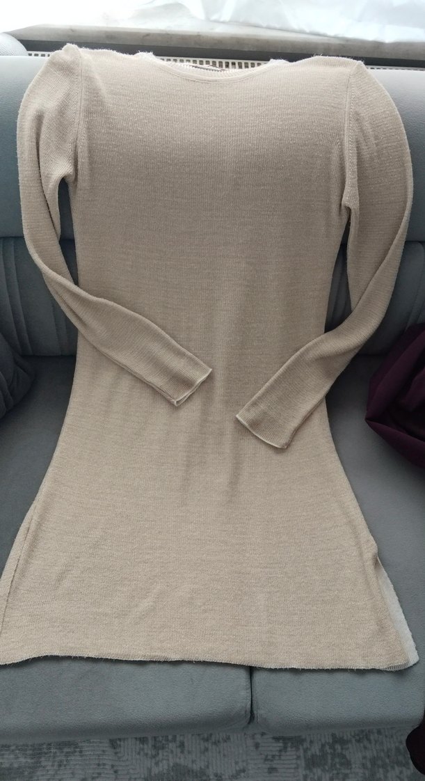 Bej renkte, yuvarlak yaka ve uzun kollu kadın triko kazak. Yumuşak sentetik kumaştan örülmüş, rahat kesim ve uzun boyda, günlük kullanıma uygundur.