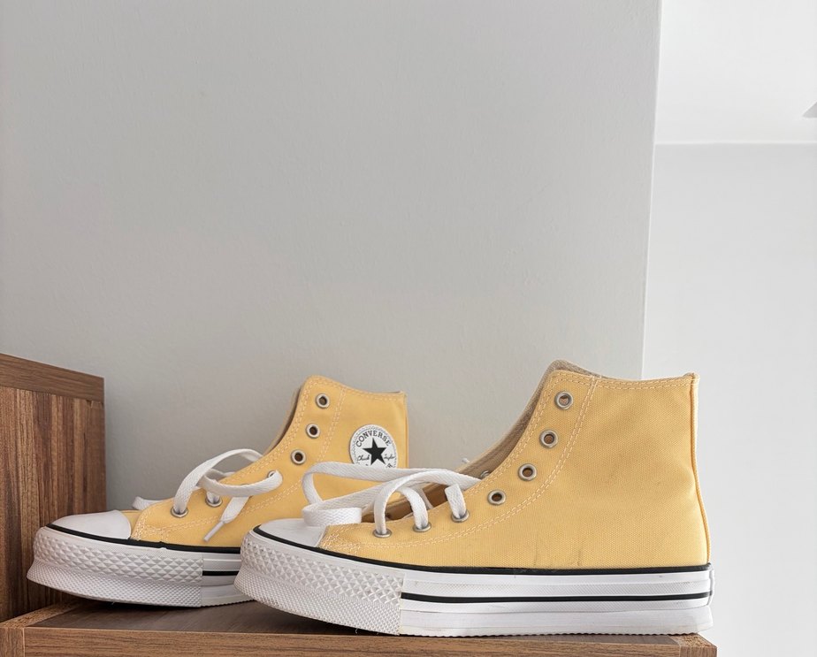 Sarı, wedge topuklu, desen içermeyen kauçuk kadın sneakers. Günlük kullanıma uygun, rahat ve şık bir tasarıma sahiptir.