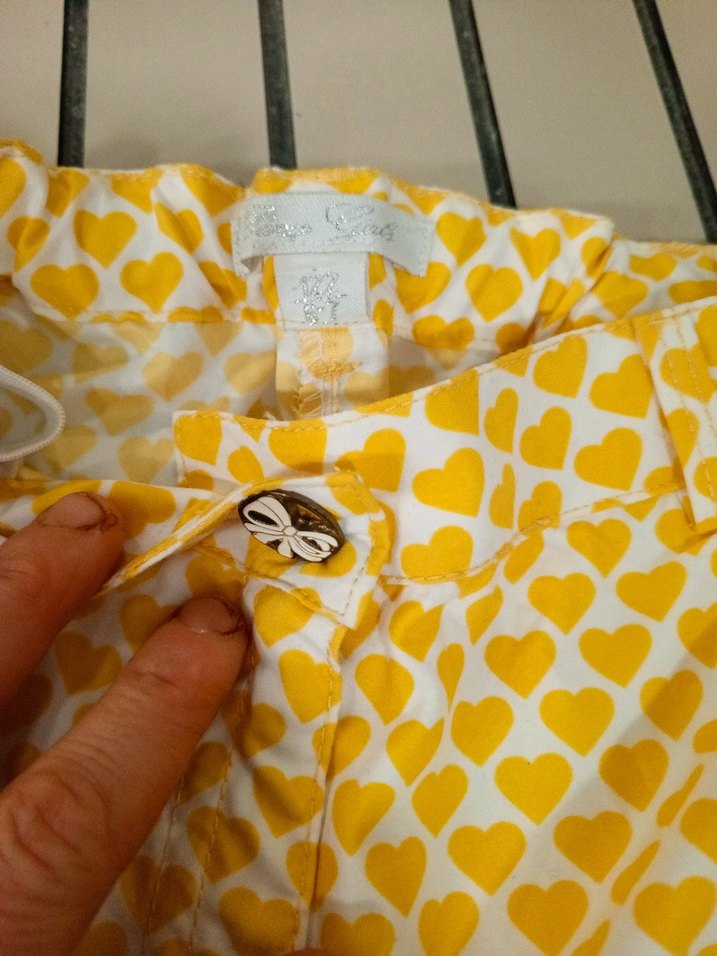 Sarı kalp desenli, düğmeli, pamuklu ve bol kesim hamile midi şort, günlük sokak stili için uygundur.