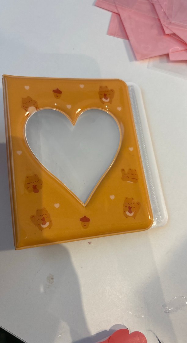 Kapakta şeffaf kalp penceresi ve küçük ayı desenleri bulunan sarı defter. Hasarsız
