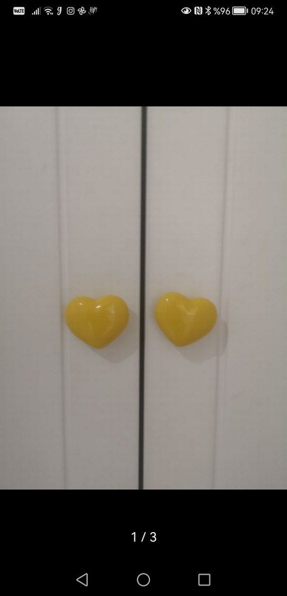 Çocuk dolapları için sarı kalp şeklinde kulplar, mobilyalara neşeli bir dokunuş katıyor. Toplam 8 adet temiz durumda
