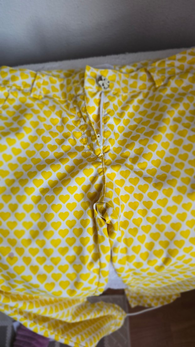 Düğmeli, sarı renkli, kalp desenli ve sentetik kumaştan yapılmış.