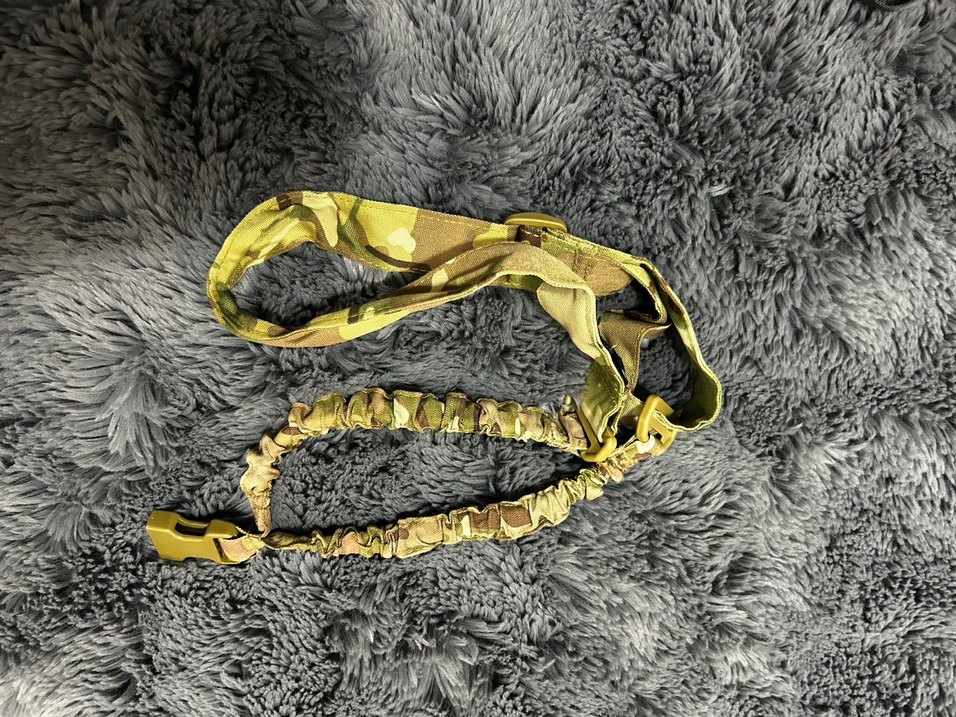 Ayarlanabilir kayışlara ve esnek bungee bölüme sahip sarı kamuflaj desenli askı kayışı