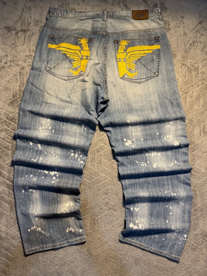 Geri ceplerinde parlak sarı kanat desenleri ve kemerli detay bulunan, bol kesim denim jean. Günlük kullanıma uygun, sokak stilini yansıtır.