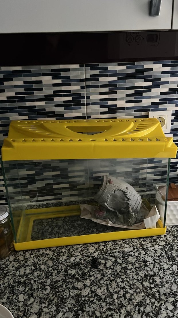 Sarı kapaklı, havalandırma delikleri bulunan ve cam gövdesiyle küçük evcil hayvanlar için uygun akvaryum tankı.