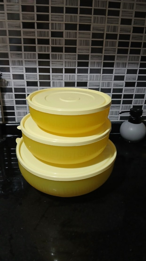 Üçlü sarı plastik kapaklı saklama kapları seti. Hafif ve üst üste konabilir, mutfakta kullanıma uygun. ölçüleri resimde mevcut hiç kullanılmadı