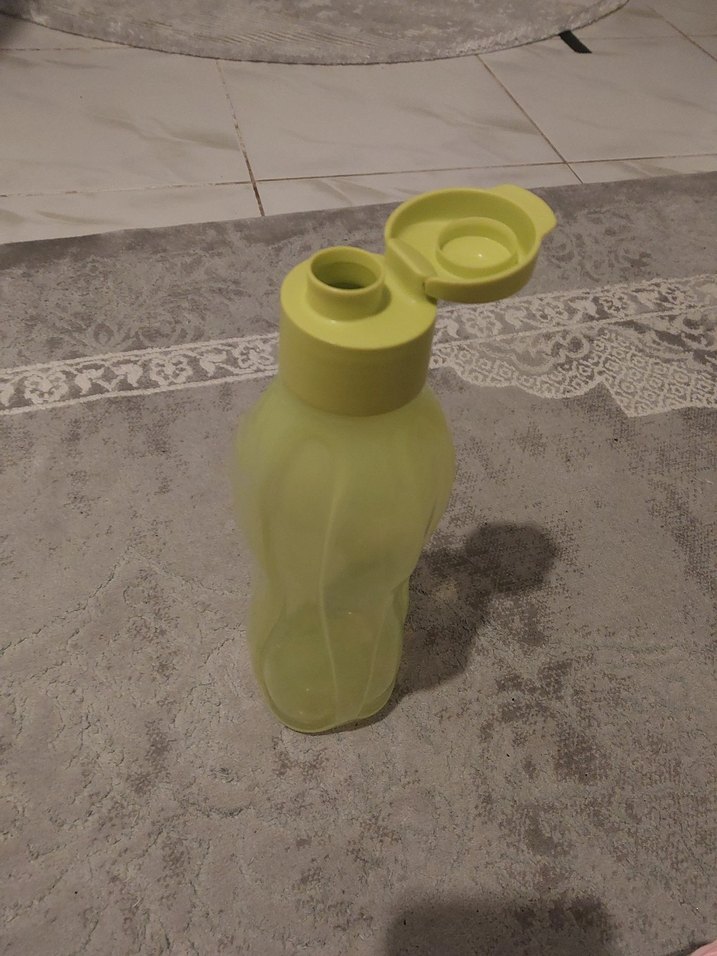 Kolay açılır kapaklı, açık sarı renkte plastik su şişesi.