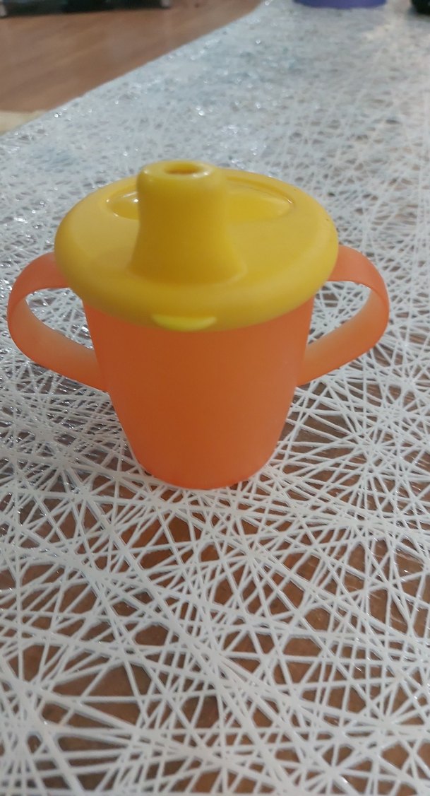 Sarı kapaklı, iki kulplu renkli bebek bardağı, kolay tutuş sağlar.