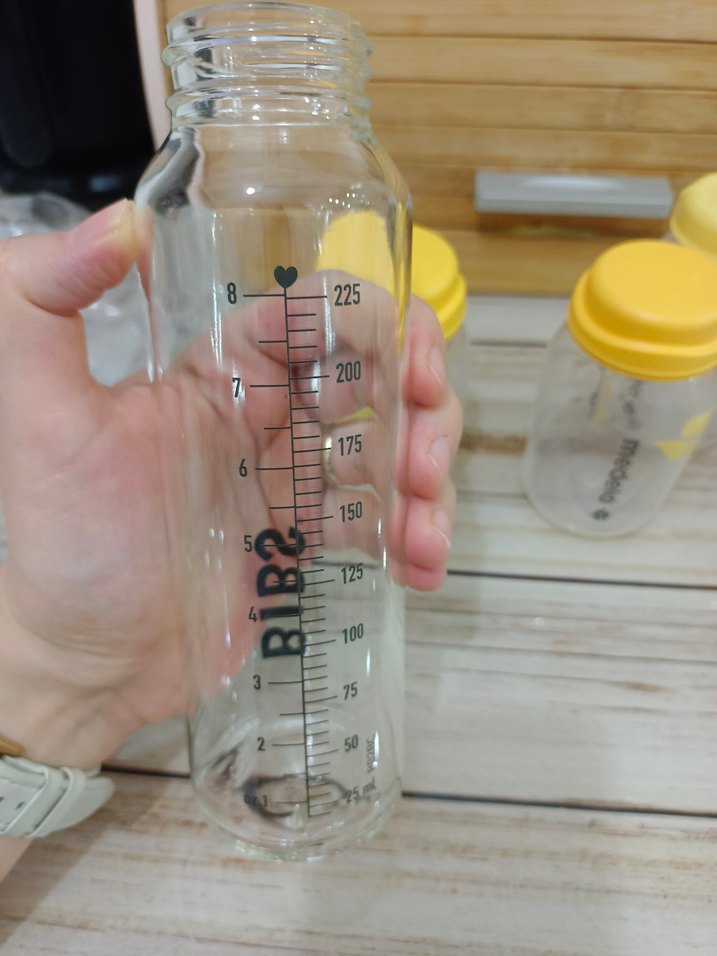 200 ml ölçü işaretli, sarı renkli kapaklı cam biberon. 225 ml'ye kadar ölçüm göstergesi bulunur.