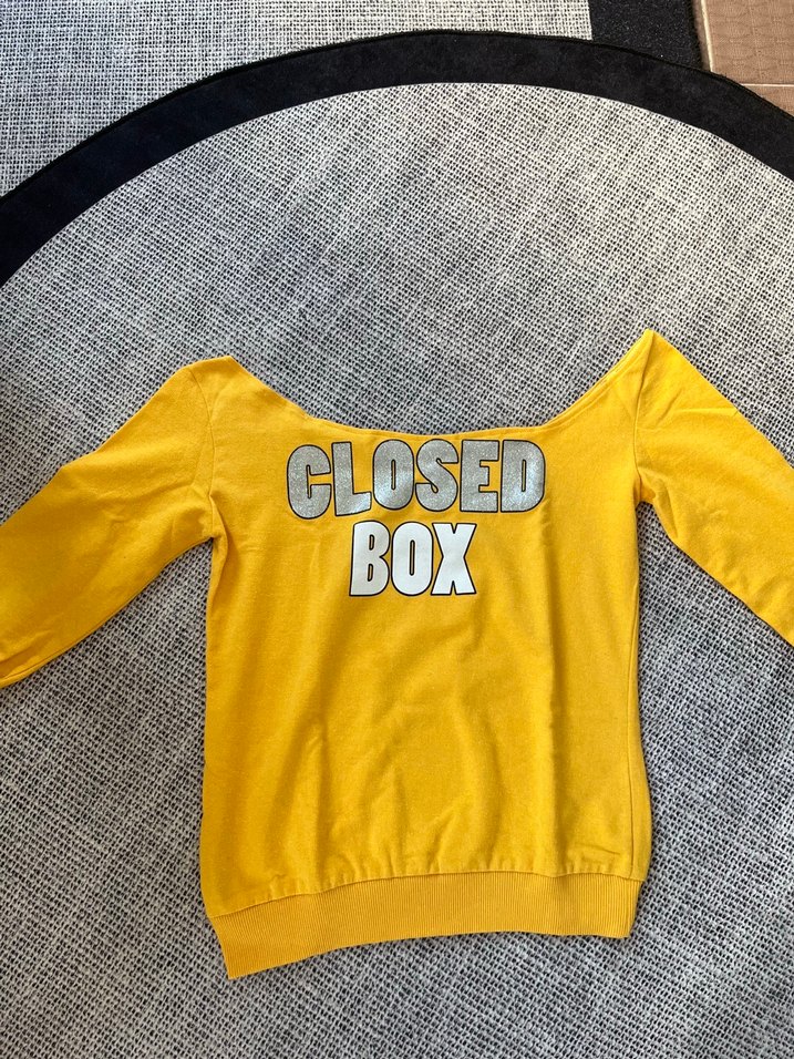 Sarı renkli, uzun kollu ve tekne yakalı pamuklu sweatshirt. Rahat kesim, baskılı 'CLOSED BOX' yazısı ve tokalı detay içerir. Spor tarzına uygundur.