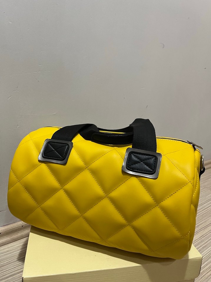 Sarı deri çanta, kapitone kare desenli ve siyah tokalı saplara sahip. Günlük kullanıma uygun,spor sokak stilini yansıtıyor.