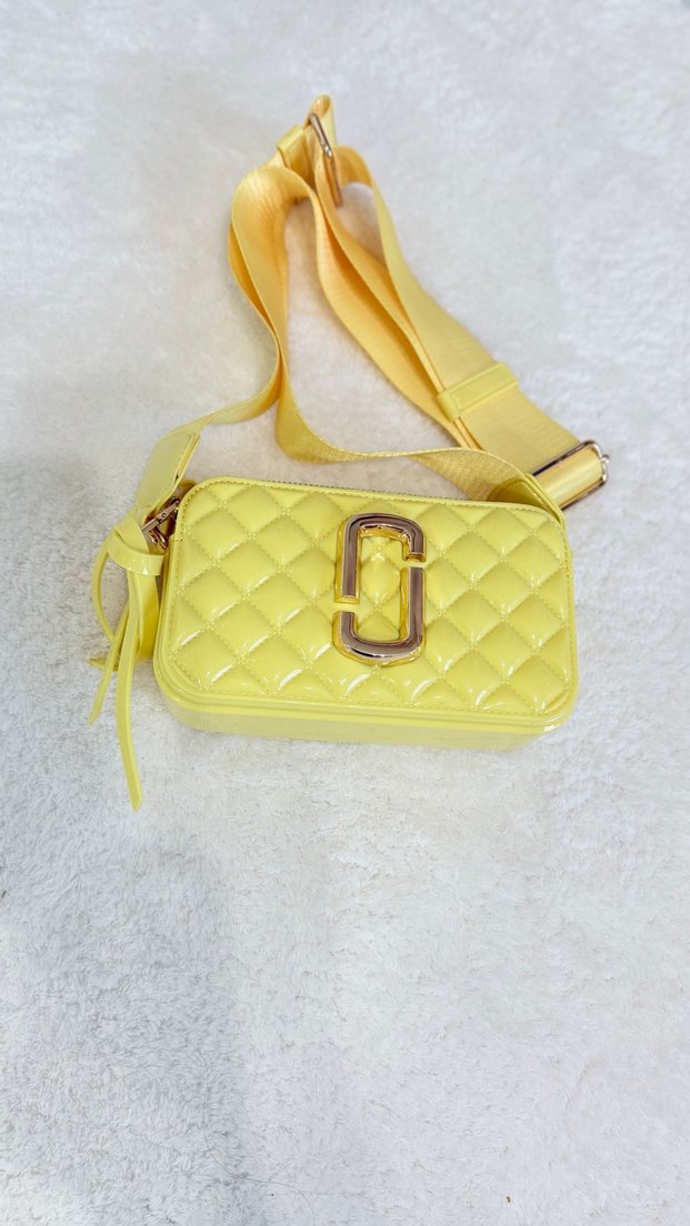 Sarı kapitone desenli, tokalı sentetik kumaştan çapraz çanta. Sokak stiline ve günlük kullanıma uygun, Paris tarzı etkisiyle. Ürün hiç kullanılmadı.