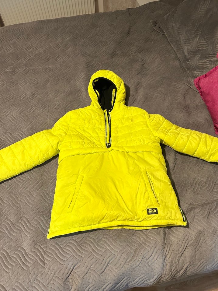 Erkek çocuk için parlak sarı renkte, kapüşonlu ve fermuarlı önden açılan bir kışlık mont. Uzun kollu, bol kesim ve yumuşak sıcak kumaştan midi boyda, günlük rahat kullanım için uygundur. Etiketin söküldüğü yerde bi iz kaldı yıkadım çıkmadı. Fotoğraflarda var. 2 kez giyildi.