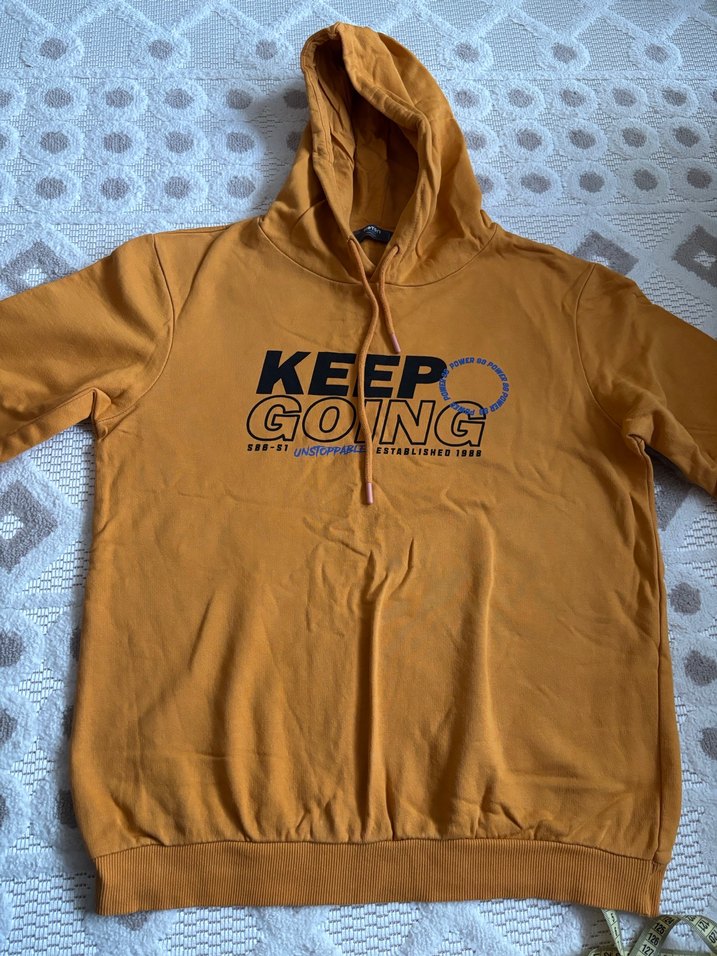 Sarı kapüşonlu, uzun kollu, bol kesim kadın sweatshirt. "KEEP GOING" baskılı ve fermuarlı detaylı, yumuşak ve sıcak kumaştan üretilmiştir. ✨