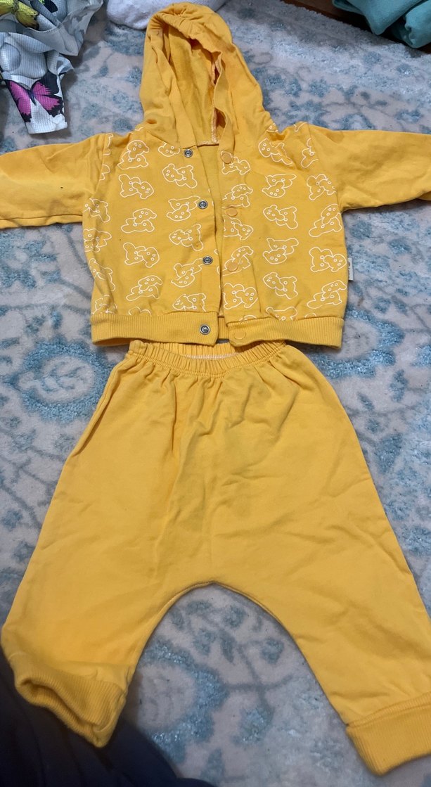 Kapüşonlu, düğmeli ve uzun kollu ceket ile rahat pantolondan oluşan bebek erkek takımı. Yumuşak, sıcak kumaştan, canlı sarı renkte ve cekette eğlenceli desenler bulunur.