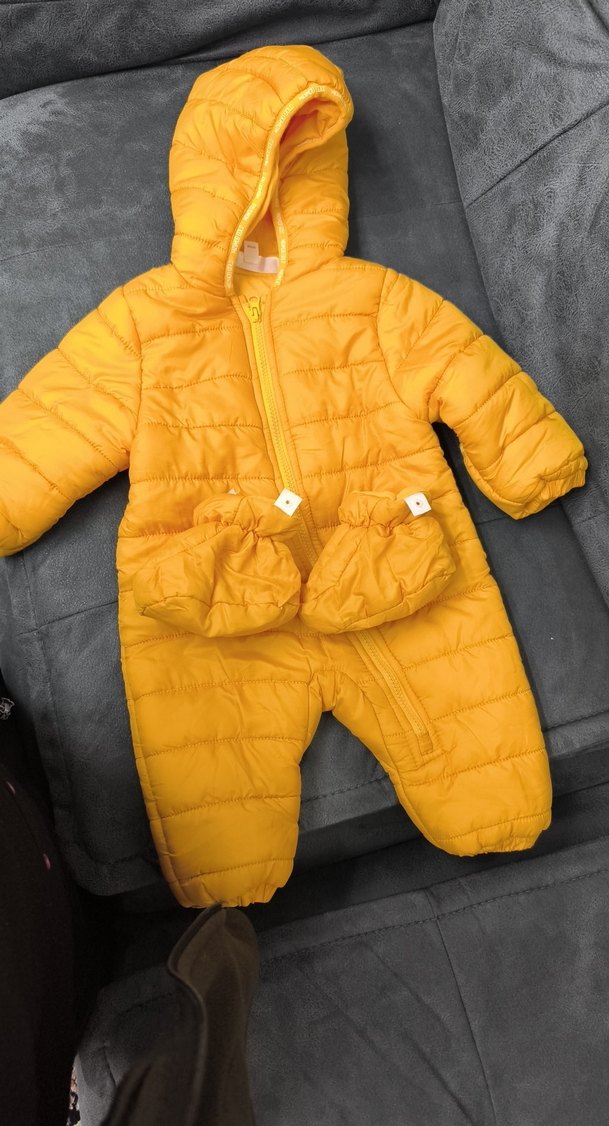 Renkli sarı bebek kayak tulumu, yumuşak ve sıcak kumaş, kapüşon ve fermuar detaylıdır. Aynı renkte botlarla tamamlanır. Sokak stili için uygundur. ❄️ sıfırdan farkı yoktur çok temizdir alanlara hayırlı olsun