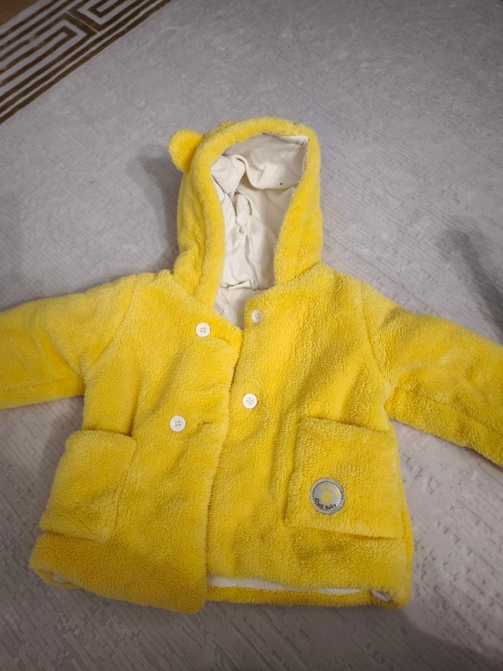 Kapüşonlu, düğmeli ve iki cepli bebek montu, yumuşak ve sıcak kumaştan, rahat kesimle sokak stiline uygun.