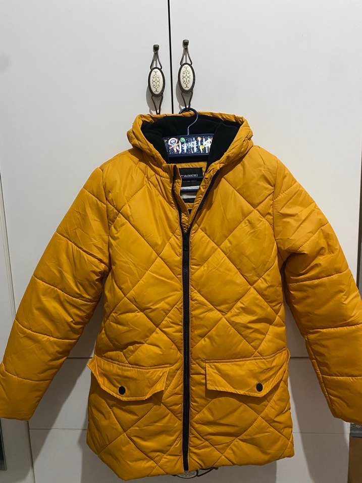 Sarı kapüşonlu kışlık mont, fermuarlı önde ve yumuşak, sıcak kumaştan. Cep detaylı, normal boy ve dar kesim, rahat sokak stili için uygun. ❄️