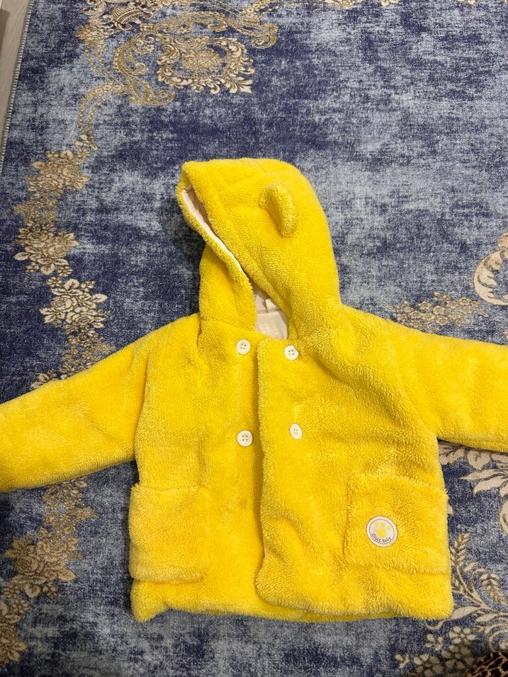 Kapüşonlu, sarı renkli ve yumuşak dokulu erkek çocuk montu. Kürklü detaylara sahip, düğmeli ve cep bulunur. Trend sokak stili için uygun bir model.