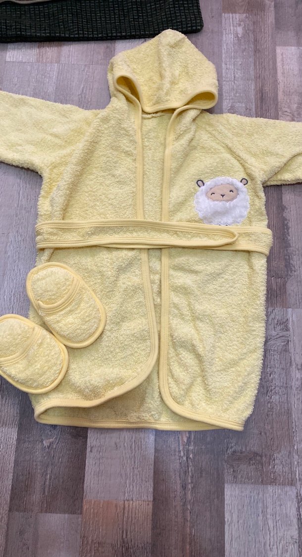 Pastel sarı renkte, kapüşonlu erkek çocuk bornozu, nakışlı kuzu desenli ve uyumlu terlik setiyle birlikte. Yumuşak ve emici dokuda.