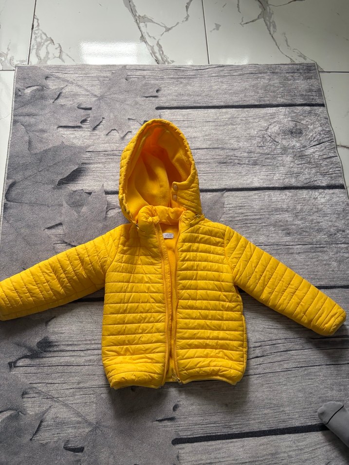 Sarı renkli, kapüşonlu ve fermuarlı erkek çocuk montu. Hello baby markalı,ebebekten alındı. 5 yaş. Çok temiz,defo,yırtık,koku,leke yok