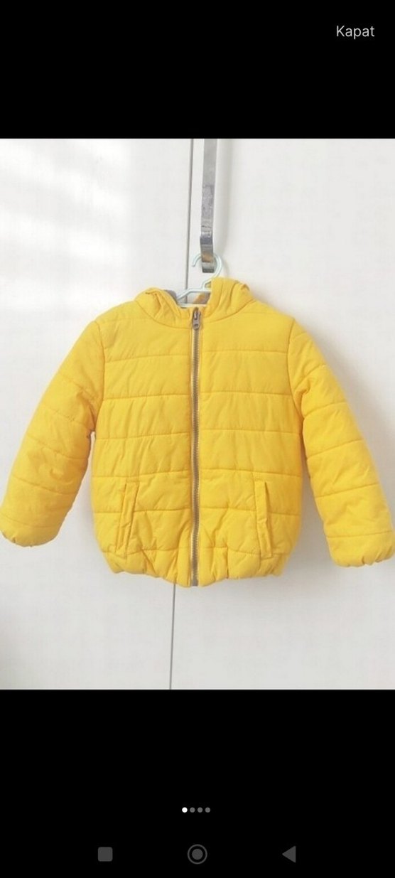 Sarı renkli, kapüşonlu ve fermuarlı erkek çocuk montu. Yumuşak ve sıcak kumaştan yapılmış, sade ve sokak tarzında. 24_36 ay. 2 kere giyildi.