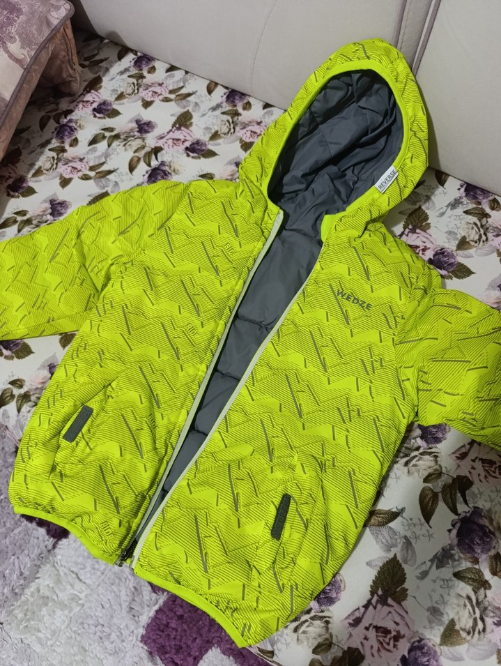 Sarı renkte, kapüşonlu ve fermuarlı erkek çocuk ceketi. Sentetik kumaştan, gri iç astarlı ve rahat kesim. Sokak stili için uygun. çift taraflı kullanıma uygun