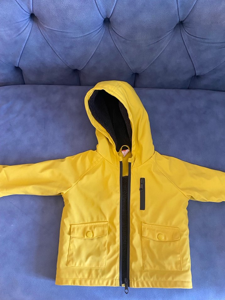 Sarı renkli, kapüşonlu ve fermuarlı, yumuşak ve sıcak dokulu erkek çocuk yağmurluğu. Notch yaka stiliyle sade ve şık. Tertemiz defosu yok