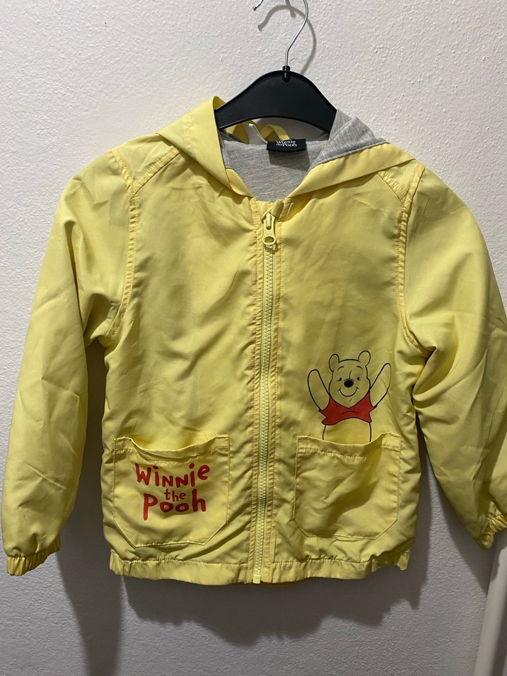 Hafif sarı renkli, fitted kesim erkek çocuk yağmurluğu. Fermuarlı, düğmeli cepli ve baskılı Winnie the Pooh figürlü. Yumuşak, sıcak kumaş, günlük sokak stili için uygun. ️