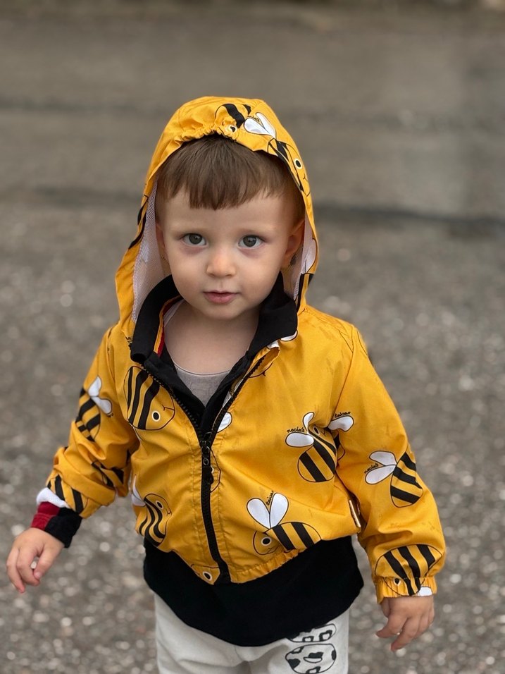 Kapüşonlu, fermuarlı ve renkli arı desenli sarı erkek çocuk yağmurluğu. Rahat kesimli ve yumuşak, sıcak kumaştan üretilmiştir.