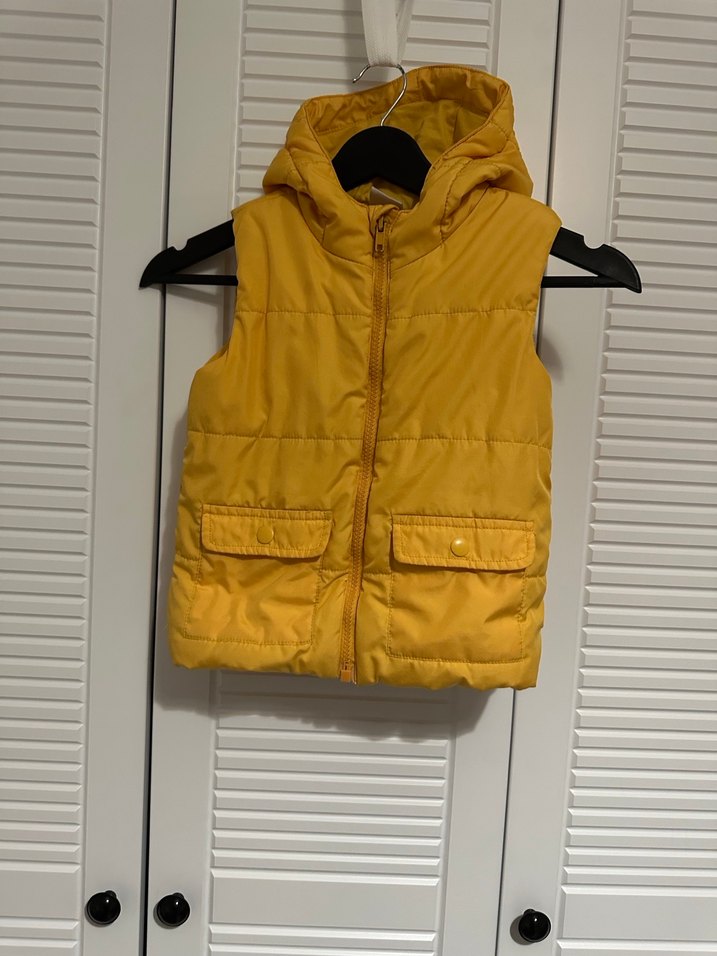 Fermuarlı önü, yakalı ve kapüşonlu sarı erkek çocuk yeleği. İki cep ve parlak görünümle, yumuşak ve sıcak dokulu kumaştan üretilmiştir. İki adet mevcut