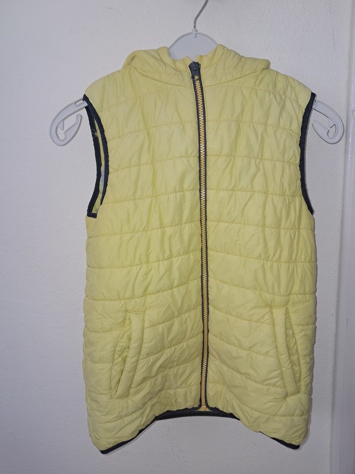 Sarı kapüşonlu, fermuarlı ve cep detaylı, yumuşak ve sıcak kumaştan erkek çocuk yeleği. Kolsuz, straplez yakalı ve fitted kesimdir.