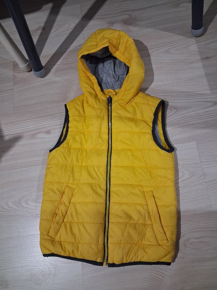 Sarı kapüşonlu, fermuarlı ve cepli erkek çocuk yeleği. Yüksek yakalı, kolsuz ve içi gri renkli yumuşak kumaşla kaplıdır.
