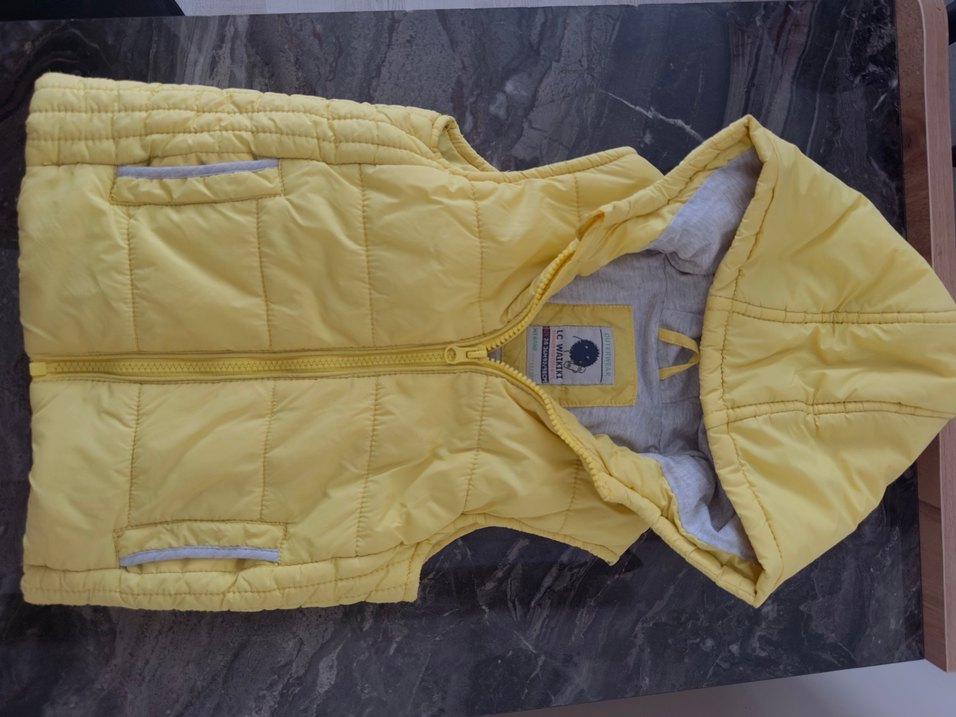 Yumuşak ve sıcak dokulu, kapüşonlu sarı erkek çocuk yeleği. Fermuarlı, kolsuz ve gri iç astarlı, fit kesimle trendy rahat stil için uygundur.