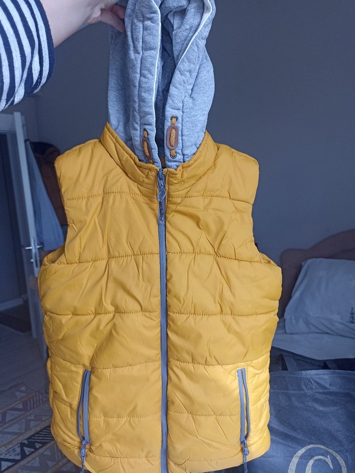 Sarı renkli, kapüşonlu erkek çocuk yeleği. Fermuarlı ve cepleri fermuarlı, sayılı giyilmiştir hiçbir sorunu yoktur 9/10 yaş
