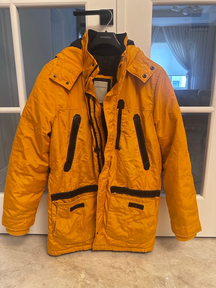 Sarı renkli, kapüşonlu detaylara sahip erkek kaban. Uzun kollu ve fermuarlı ceplidir, yumuşak ve sıcak kumaştan üretilmiştir. ✨hiç giyilmedi yeni gibi