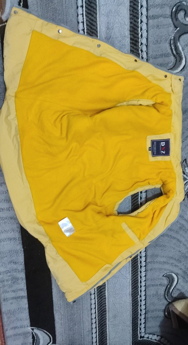 Kapüşonlu, fermuarlı, kolsuz sarı erkek ceket, sokak tarzı ve sportif uyumlu, dış mekan kullanımı için uygundur. M beden. arkasında hafif bir siyahlık var ama belli değil.