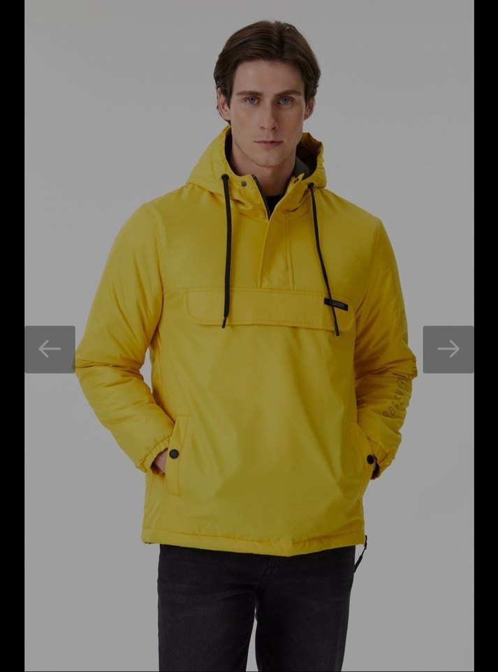 Sarı renkli, kapüşonlu ve fermuarlı cepli erkek mont. Salaş kesim, uzun kollu ve parlak dokunuşlu, dış mekan için uygun. İçi kapitone.