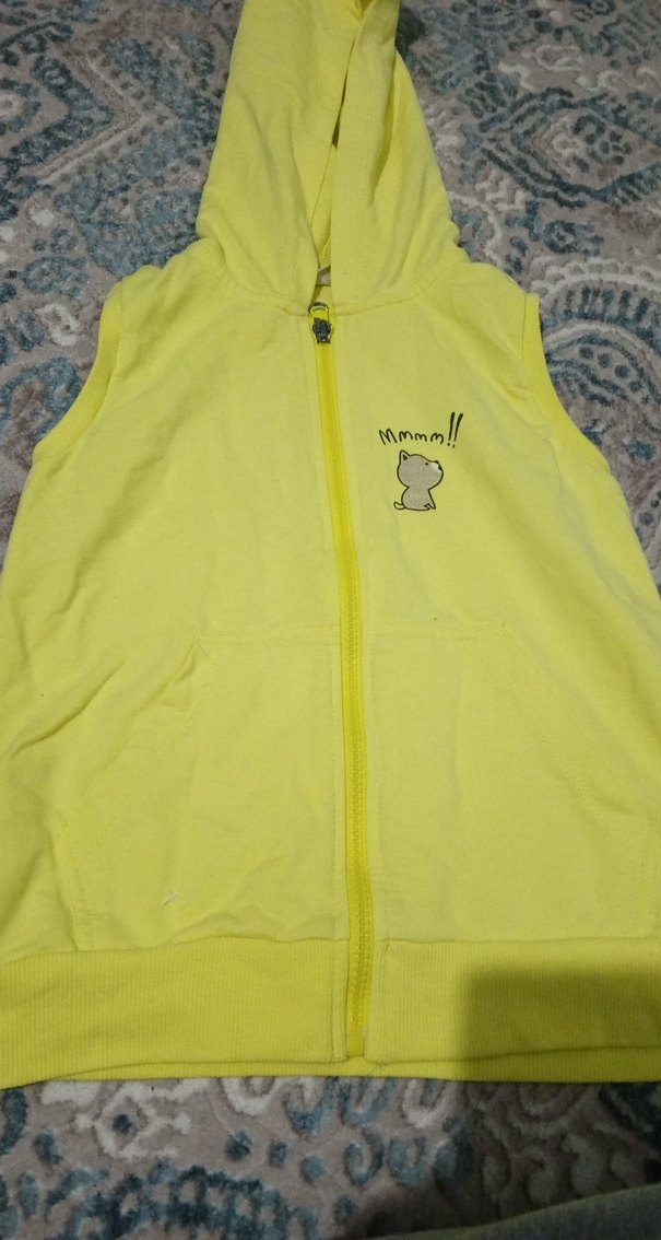 Kapüşonlu ve fermuarlı, yumuşak ve sıcak kumaştan yapılmış çocuk yeleği. Fitted kesim ve küçük baskılı detaylı, pastel sarı renkte.