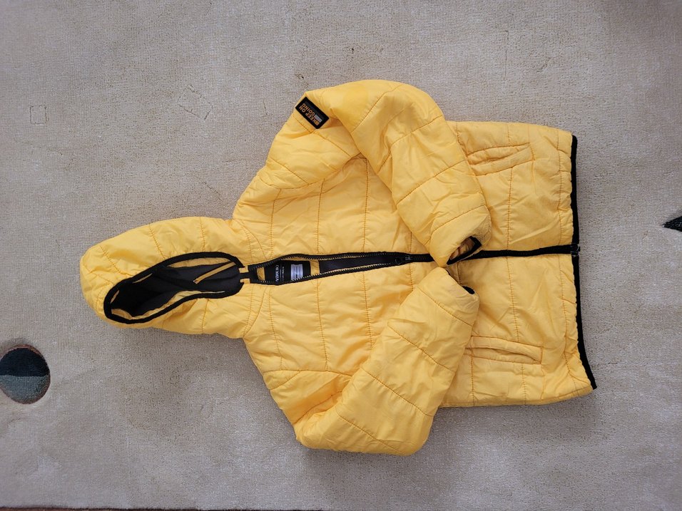 Parlak sarı renkte, kapüşonlu ve fermuarlı, yumuşak ve sıcak kumaştan yapılmış, sade ve desensiz, dar kesim erkek çocuk montu.