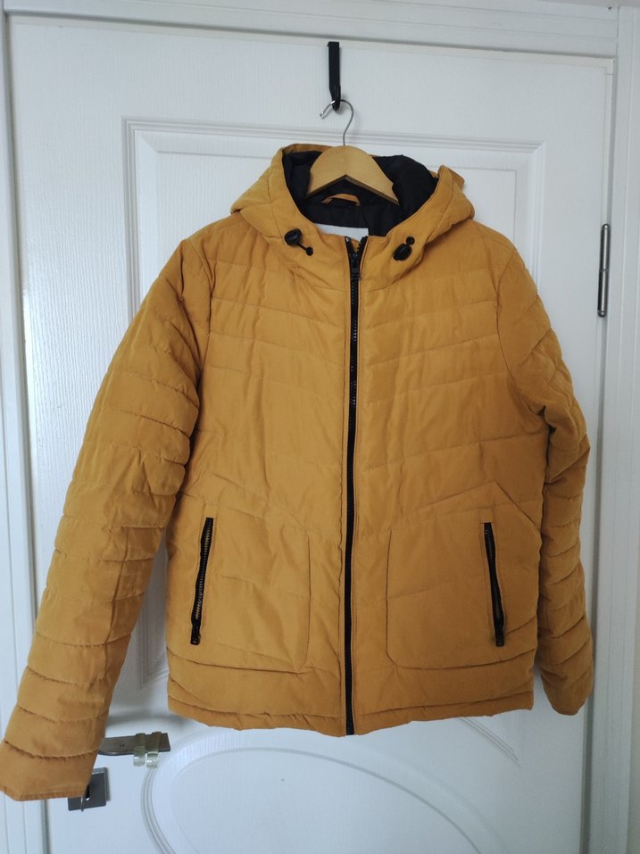 Sarı renkte, kapüşonlu ve fermuarlı ceplere sahip, fitted kesim erkek mont. Midi boy ve askılı kollu, soft ve rahat kumaştan üretilmiştir. Göğüs 55 boy 66 cm. dir.