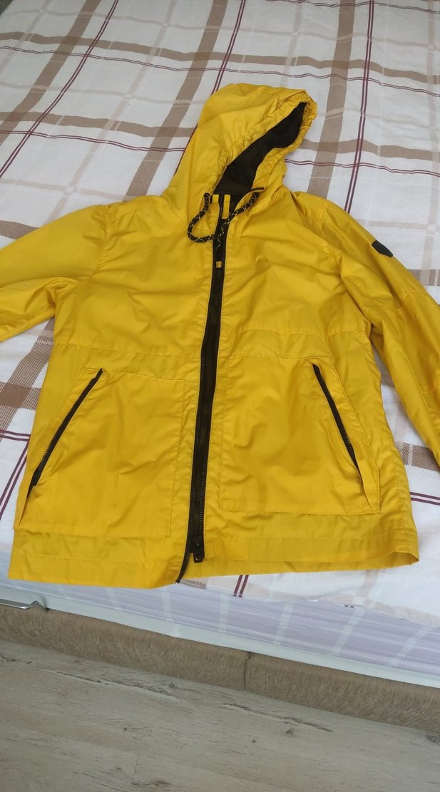 Sarı, kapüşonlu ve fermuarlı erkek mont. Sentetik kumaştan, uzun kollu ve parlak görünümlü, gündelik dış mekan kullanımı için uygun.