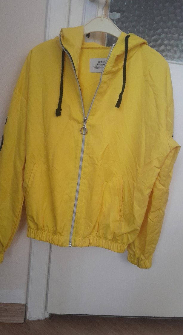 Parlak sarı renk, kapüşonlu ve fermuarlı, uzun kollu bol kesim kadın ceket. Sentetik kumaştan üretilmiştir, günlük kullanıma uygundur.