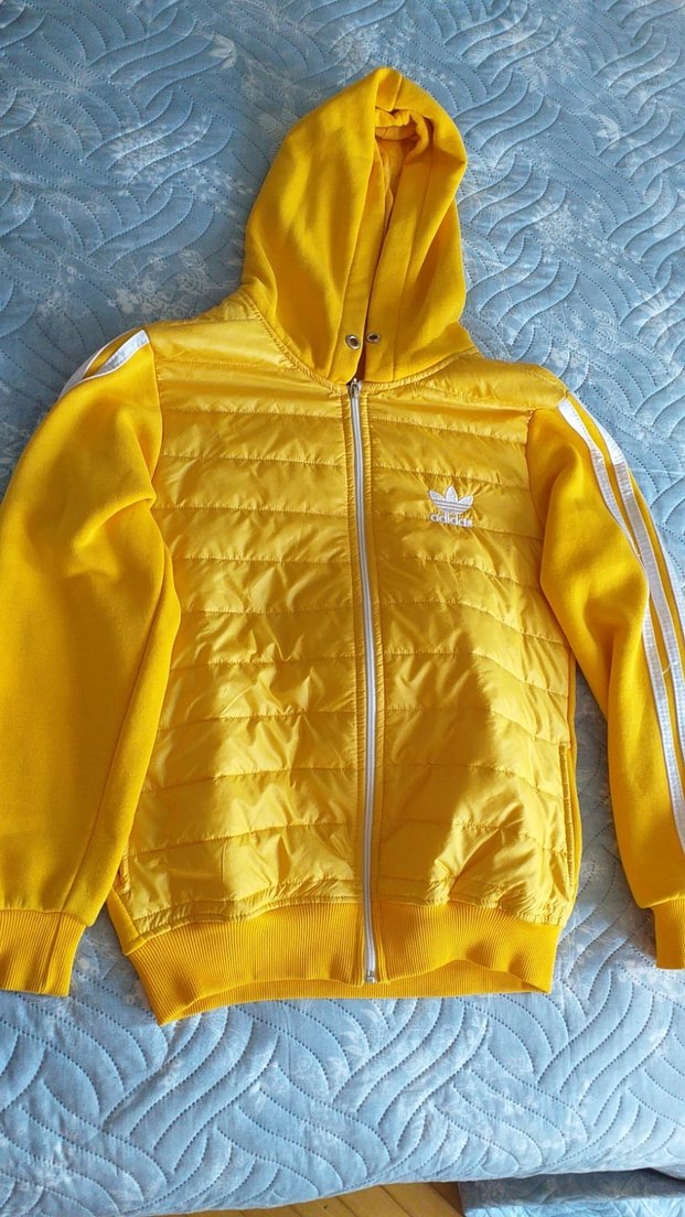 Sarı kapüşonlu ve fermuarlı, yumuşak ve kapitone kumaşların birleşimiyle renkli bir streetwear tarzı sunan, uzun kollu, normal boyda dar kesim kadın ceketi.