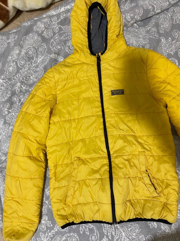 Sarı uzun kollu, fermuarlı ve kapüşonlu, yumuşak ve sıcak kumaştan yapılmış mont. İnce kesimli, çıtçıtlı yaka ve parlak görünümlü, günlük kullanıma uygun.