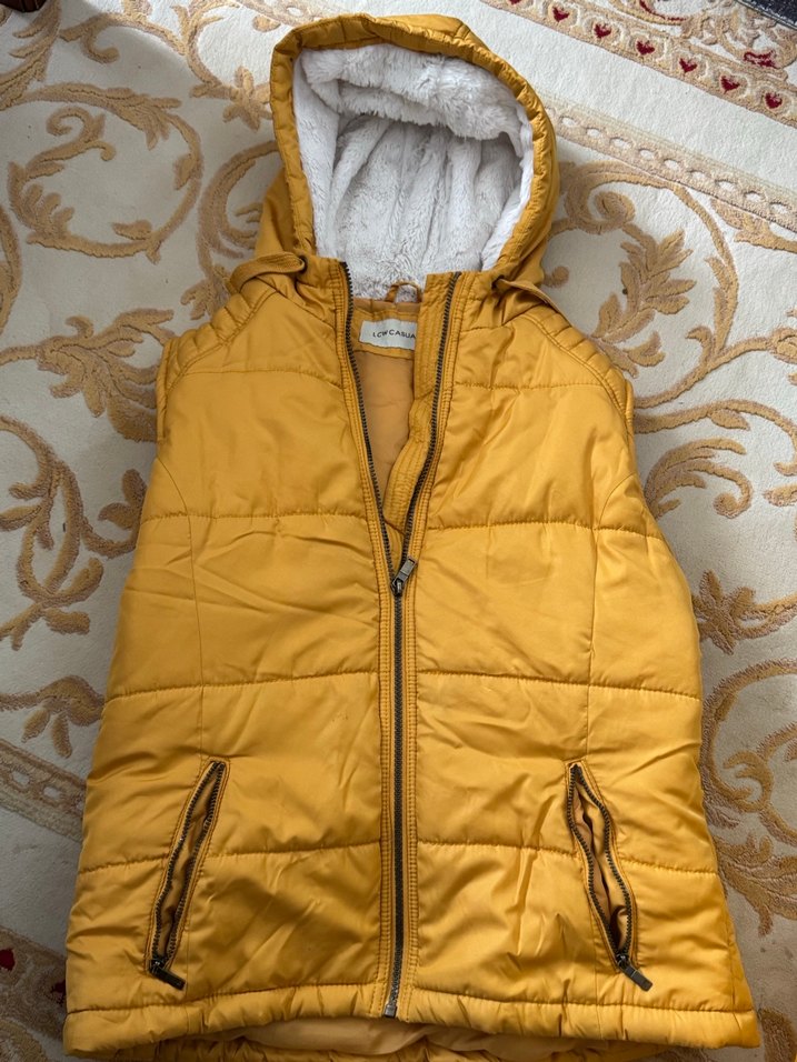 Sarı, kapüşonlu ve fermuarlı, kolsuz şişme yelek. Yumuşak iç yüzeyiyle sıcak tutar, parlak ve desensiz yüzeye sahiptir. Günlük rahat kullanıma uygundur.