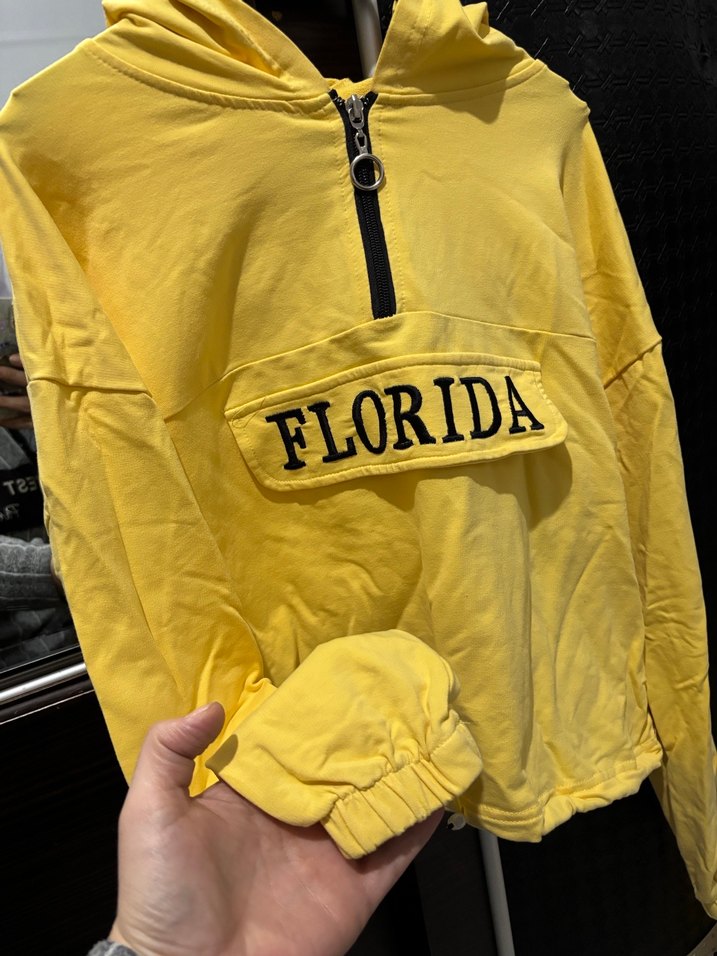 Sarı kapüşonlu sweatshirt, ön fermuar ve renkli 'FLORIDA' baskısıyla. Uzun kollu, bol kesim ve kısa boyda, rahat ve şık bir tasarım.