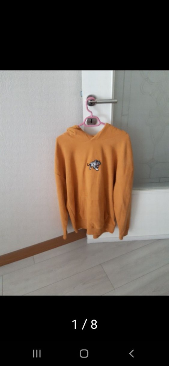 hardal rengi kapüşonlu sweatshirt, rahat kesim ve uzun kolludur. Göğüs kısmında baskılı kaplan deseni bulunur, rahat ve şık bir görünüm sunar.