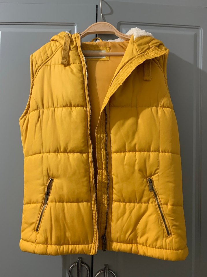 Sarı renkli, kapüşonlu ve fermuarlı kadın şişme yelek. Çok az kullanıldı hiçbir sorunu yok. Bedeni kırk yazıyor ama o kadar büyük değil S/M beden için uygun.