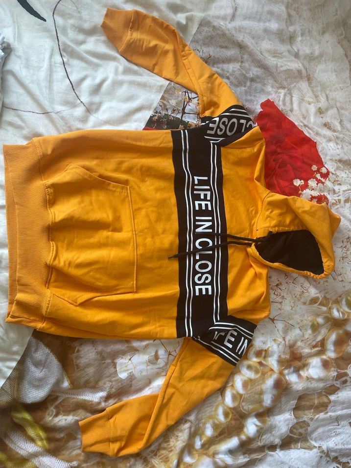 Kadınlar için uzun kollu, kapüşonlu ve bol kesim sarı sweatshirt. "LIFE IN CLOSE" baskılı ve fermuarlı, yumuşak ve sıcak kumaştan üretilmiştir.